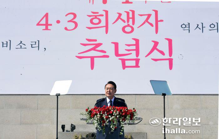 윤석열 대통령이 지난 2022년 당선인 자격으로 제주 4·3평화공원에서 열린 제74주년 4·3희생자 추념식에서 추념사를 하고 있다.