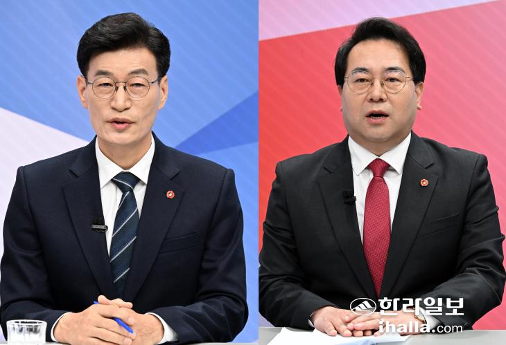 25일 KCTV제주방송 스튜디오에서 열린 언론 4사 제22대 국회의원 선거 후보 초청 토론회에 나선 더불어민주당 문대림 후보(왼쪽)와 국민의힘 고광철 후보. 공동취재단
