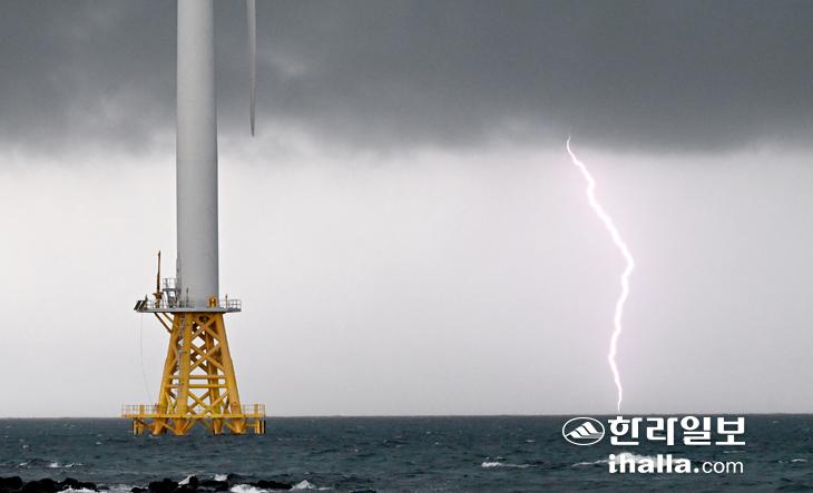 돌풍과 함께 천둥·번개를 동반한 강한 비가 내린 25일 오전 제주시 한경면 금등리 풍력발전기 너머 해상에 번개가 치고 있다. 강희만기자