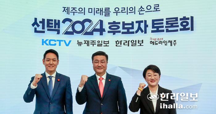 26일 KCTV제주방송 스튜디오에서 열린 언론 4사 제22대 국회의원 선거 후보 초청 토론회에 나선 더불어민주당 김한규 후보와 국민의힘 김승욱 후보, 강순아 후보(왼쪽부터). 공동취재단
