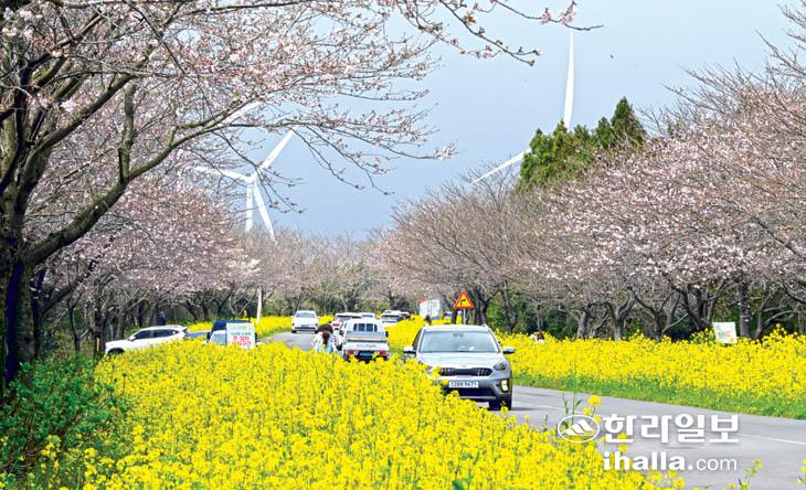 유채꽃잔치를 사흘 앞둔 26일 서귀포시 표선면 가시리 녹산로 주변으로 유채꽃이 활짝 폈다. 벚꽂도 막 피기 시작해 조만간 유채꽃과 벚꽃이 어우러지며 최고의 드라이브 코스가 될 것으로 보인다. 강희만기자