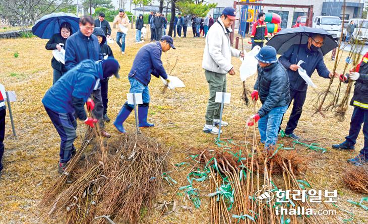 제주시 구좌읍사무소가 26일 구좌읍체육관 주차장에서 나무 나눠주기 행사를 진행하고 있다. 강희만기자