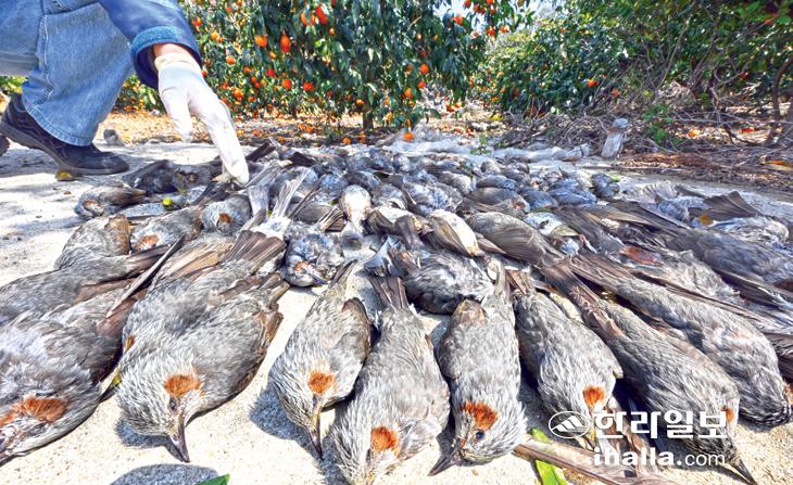 [한라일보] 제주 서귀포시 남원읍의 한 감귤밭에서 직박구리, 동박새 등 200여 마리가 집단 폐사한 것으로 나타났다. 서귀포시는 경찰 수사를 요청하는 것과 함께 위법 사항이 드러나면 고발 등을 진행할 예정이다.
