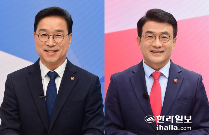 27일 KCTV제주방송에서 열린 언론4사 초청 토론회에 참석한 더불어민주당 위성곤(왼쪽) 후보와 국민의힘 고기철 후보. 공동취재단