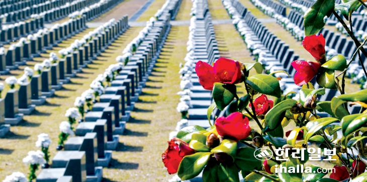제주4·3평화공원 행불자묘역과 동백꽃의 모습.
