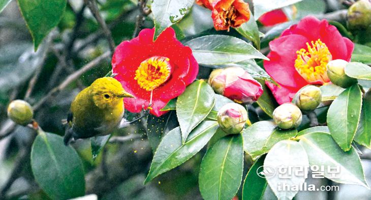 제주시 이도동 한 과수원 울타리에 활짝 핀 동백꽃에 동박새들이 찾아와 꿀을 따먹고 있다.