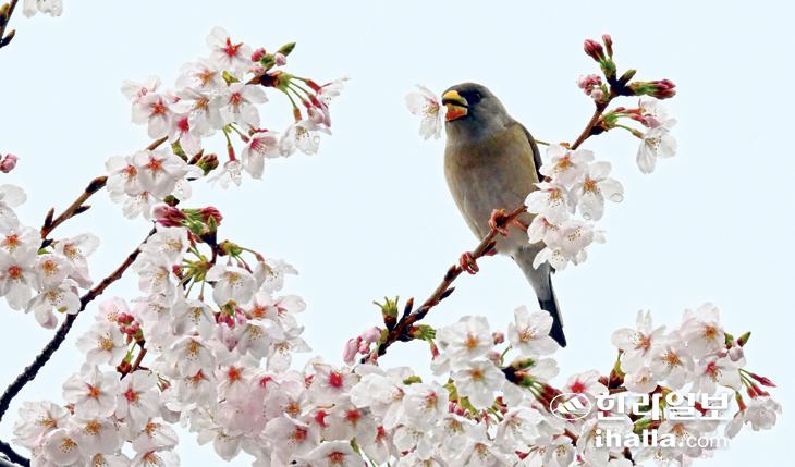 봄비가 내린 28일 제주시 연동 제주도의회 정원에 심어진 왕벚나무에 밀화부리들이 날아와 꽃을 따 먹고 있다. 강희만기자