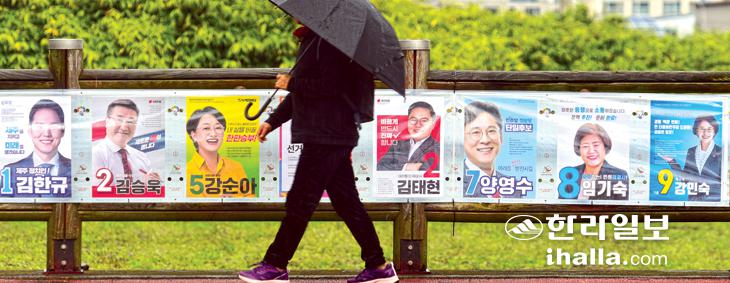 국회의원 선거와 도의회 보궐선거 공식 선거운동이 시작된 28일 제주시 아라동에 후보자 7명의 얼굴이 담긴 선거벽보가 붙어 있다. 이상국기자