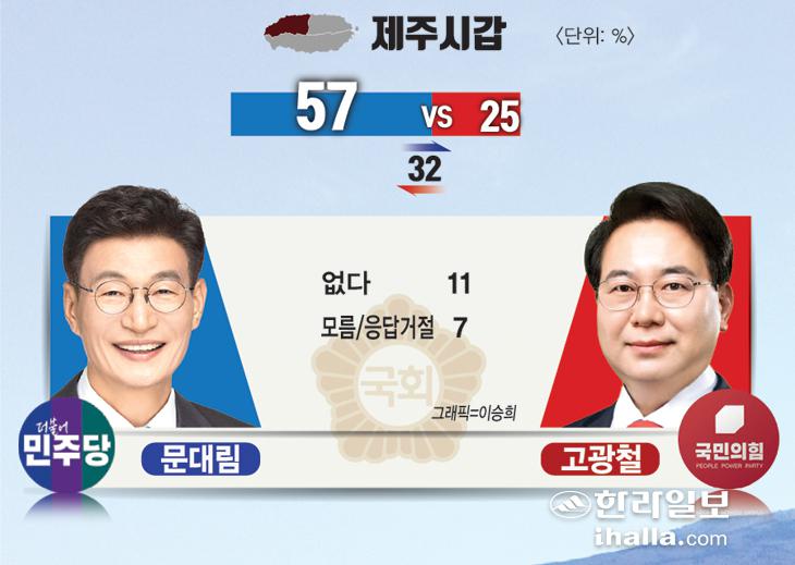 공천 과정에서 탈락한 더불어민주당 송재호 의원의 불출마로 무주공산이 된 제주시갑 선거구 후보 지지도 조사에서는 맞대결에 나선 문대림 후보가 57%로 고광철 후보(25%)를 32%p(포인트) 앞서고 있다. 당선 가능성 조사에서도 문대림 후보가 67%로, 고광철 후보(17%)와 격차를 크게 벌리고 있다.