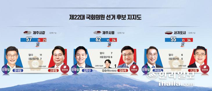최근 실시한 제주지역 4·10 총선 여론조사 결과, 더불어민주당 문대림(제주시갑)·김한규(제주시을)·위성곤(서귀포시) 후보가 지지도와 당선 가능성에서 모두 2위 후보들과 오차범위 밖에서 격차를 벌이며 선두를 달리고 있다. 이를 국민의힘 후보 고광철(제주시갑)·김승욱(제주시을)·고기철(서귀포시) 후보가 그 뒤를 추격하는 양상이다.