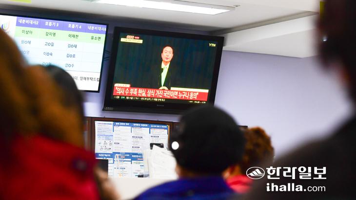 1일 제주대학교병원을 찾은 환자들이 윤석열 대통령 대국민 담화 방송을 시청하고 있다. 이상국기자