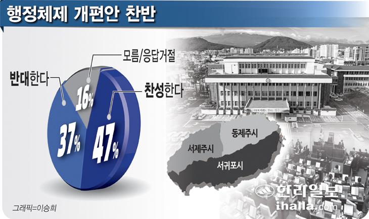 행정구역을 동제주시, 서제주시, 서귀포시 3개로 조정하는 행정체제 개편안에 대해 찬반 여부를 묻는 질문에 응답자 47%가 찬성했고 반대는 37%였다.