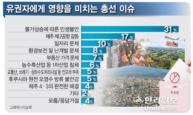 [한라일보] 제22대 국회의원선거에서 가장 큰 영향을 미칠 제주지역 이슈는 물가상승에 따른 민생불안으로 꼽혔다. 최근 고물가, 고유가, 고금리 등으로 서민경제가 악화되면서 이를 극복할 수 있는 대안, 공약 등에 대한 도민들의 관심이 높아진 것으로 분석된다.
