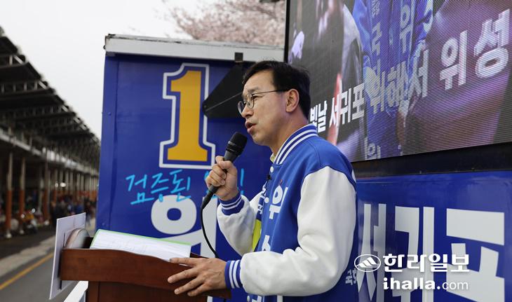 위성곤 후보가 4일 서귀포향토오일장에서 유세를 펼치고 있다. 위성곤 후보 선거사무소 제공