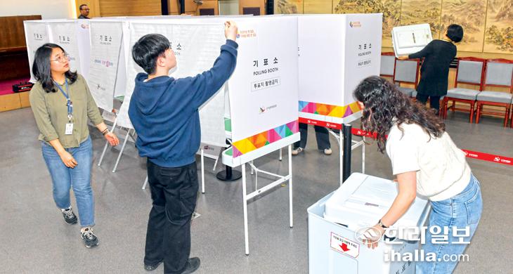 제22대 국회의원선거 사전투표일을 하루 앞둔 4일 제주도의회 1층 사전투표소에 기표대가 설치되고 있다. 이상국기자