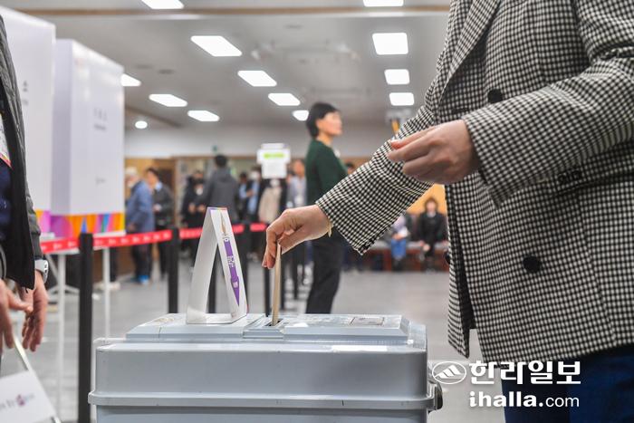 제22대 국회의원 선거 사전투표일인 5일 오전 제주자치도의회 대회의실에서 마련된 제주시 연동 사전투표소에서 유권자들이 소중한 한표를 행사하고 있다. 강희만 기자