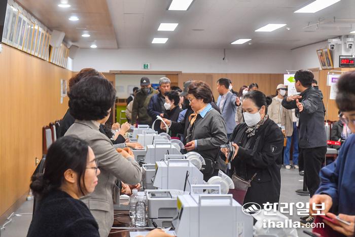 [한라일보] 제22대 국회의원 선거 사전투표일인 5일 오전 제주자치도의회 대회의실에서 마련된 제주시 연동 사전투표소에서 유권자들이 소중한 한표를 행사하고 있다. 이날 오전 11시 10분 기준 제주지역 사전 투표율 유권자 56만6611명 중 2만8496명이 참여해 5.03%를 보이고 있다.