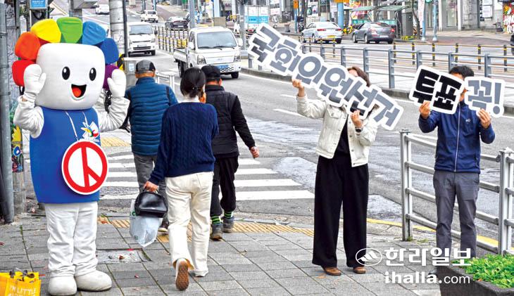 제22대 국회의원 선거 투표일을 이틀 앞둔 8일 제주도선거관리위원회가 제주시청 인근에서 시민들을 대상으로 투표 참여 캠페인을 벌이고 있다. 강희만기자