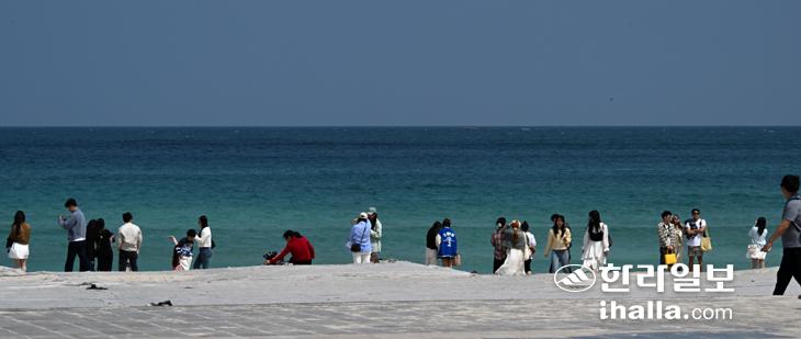 9일 제주시 조천읍 함덕해수욕장을 찾은 관광객들이 제주의 봄바다 정취를 한껏 느끼고 있다. 강희만기자
