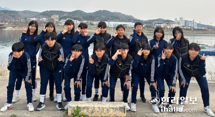 '행복교육도시 화천, 2024 춘계 여자축구 연맹전'에 출전하는 제주서중 축구팀이 기념촬영을 하고 있다.