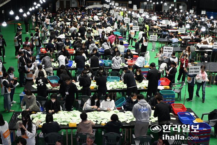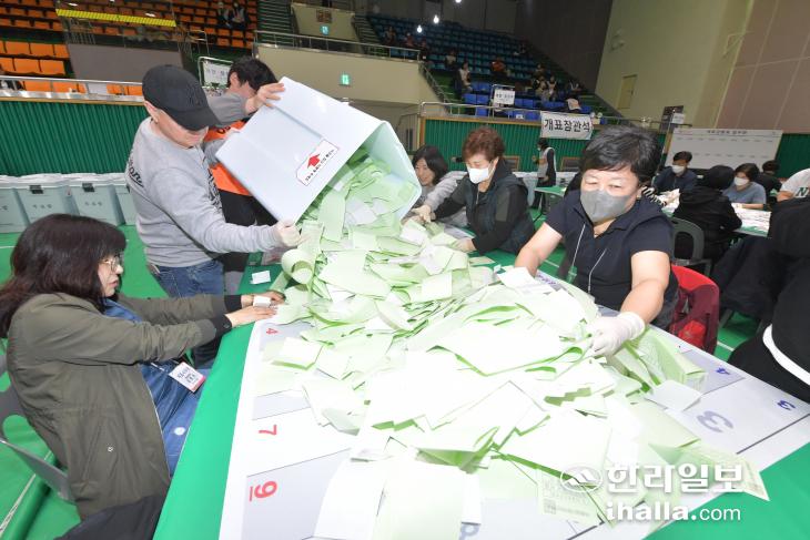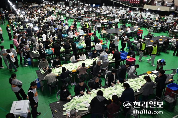 10일 제22대 국회의원선거 투표가 마감된 가운데 제주시 한라체육관 개표소에서 개표 작업이 진행되고 있다. 제주도사진기자회