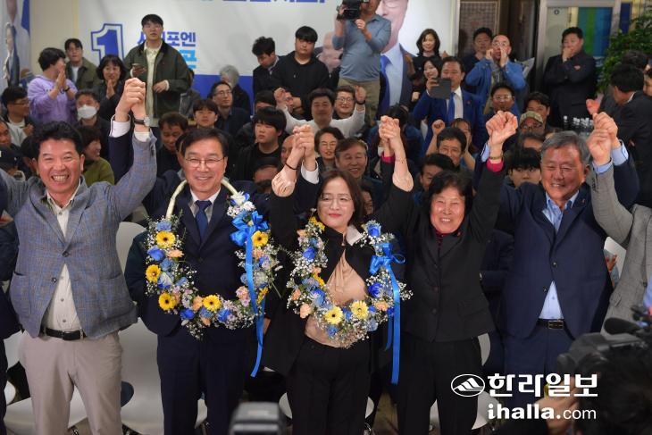 제주시을 더불어민주당 김한규 후보가 총선 다음날인 11일 당선이 확정되자 지지자들과 함께 기뻐하고 있다. 제주도사진기자회