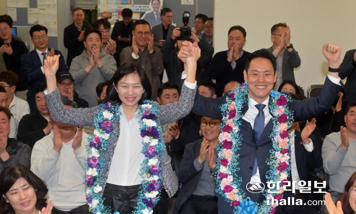 제주시갑 더불어민주당 문대림 후보가 총선 당일인 10일 당선이 확정되자 두 손을 들어올리며 승리의 기쁨을 표현하고 있다. 제주도사진기자회