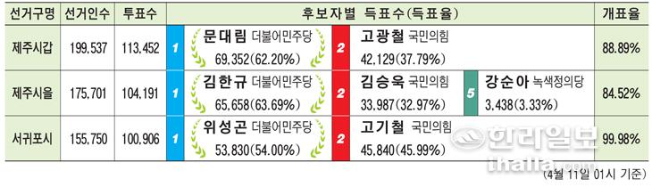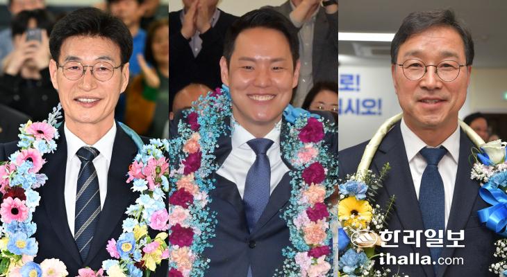 제22대 국회의원선거에서 당선된 더불어민주당 제주시갑 문대림, 제주시을 김한규, 서귀포시 위성곤 후보. 제주도사진기자회