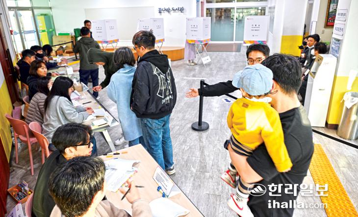 한 표 행사하는 유권자들제22대 국회의원 선거일인 10일 유권자들이 제주시 한라초등학교에 설치된 연동제8 투표소에서 한 표를 행사하고 있다. 강희만기자