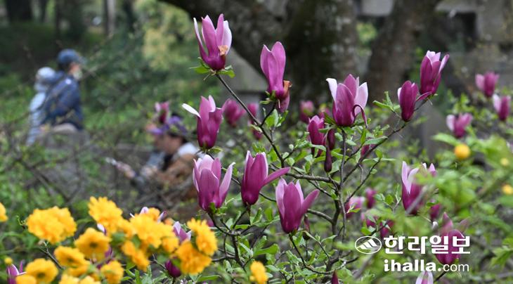 15일 제주시 한라수목원에 자목련이 꽃망울을 터트려 탐방객들의 눈길을 사로잡고 있다. 강희만기자