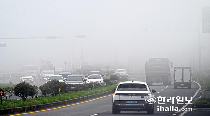 비가 내린 15일 번영로 일대에 짙은 안개가 끼자 운전자들이 서행하고 있다. 강희만기자