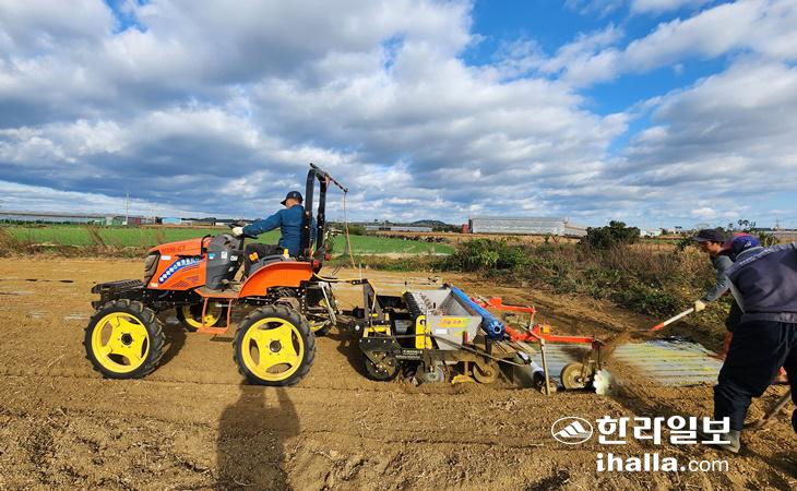 기계를 이용해 마늘 파종 작업을 하고 있다. 서귀포시 제공