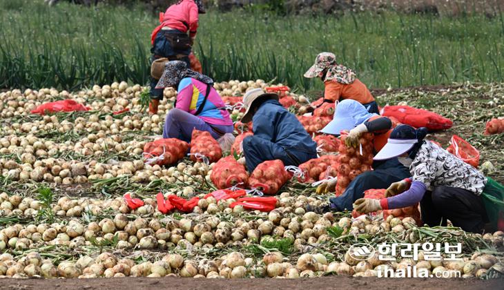 16일 서귀포시 대정읍 일과리의 한 밭에서 농민들이 따스한 봄햇살을 받으며 양파 수확을 하고 있다. 강희만기자