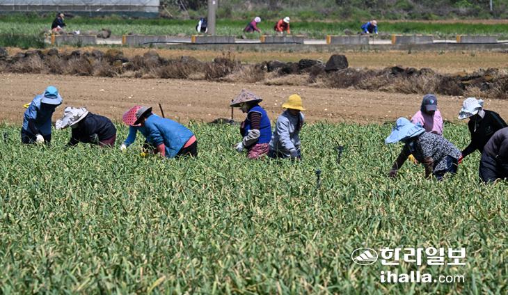 18일 서귀포시 대정읍 무릉리 한 농경지에서 농민들이 마늘종 뽑기 작업을 하고 있다. 강희만기자