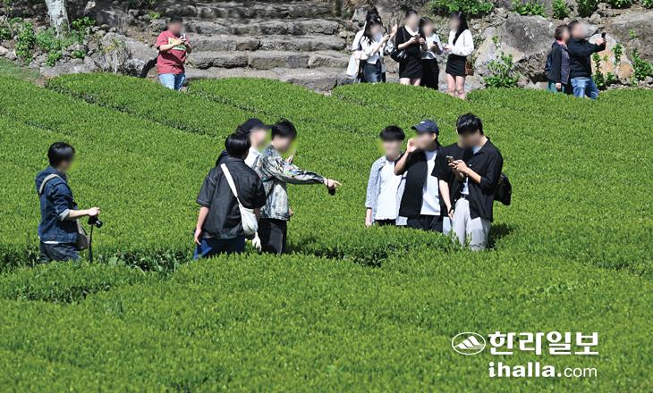 18일 서귀포시 안덕면 서광리 서광다원을 찾은 관광객들이 주변 경관을 감상하며 사진을 찍고 있다. 강희만기자