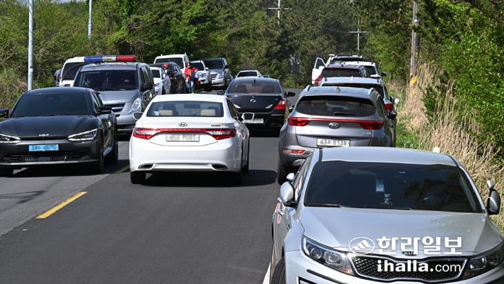 18일 제주시 산록도로에 고사리 채취객들이 타고 온 차들이 주차돼 교통 흐름을 방해하고 있다. 강희만기자