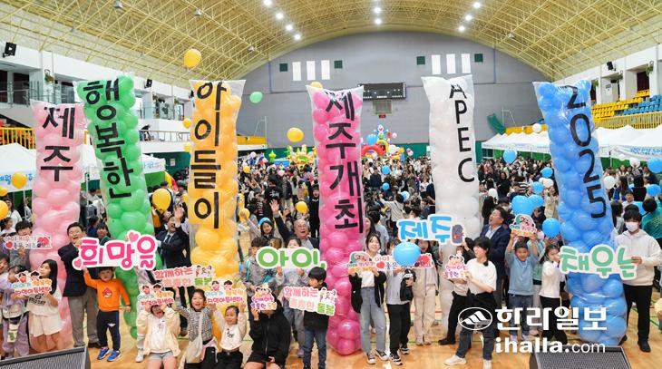 지난 20일 제주시 한림체육관에서 ‘2024년 제9회 지역아동센터 체험놀이마당’이 열린 가운데 아이들이 모여 레크리에이션을 즐기고 있다. 강희만기자