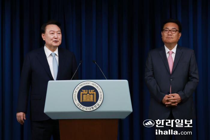 윤석열 대통령이 22일 서울 용산 대통령실 청사에서 열린 인사브리핑에서 신임 대통령 비서실장으로 임명된 국민의힘 정진석 의원을 소개하고 있다. 연합뉴스