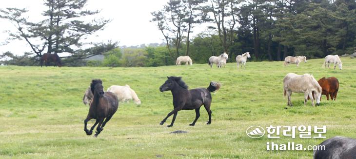22일 제주시 용강동 마방목지에서 제주마들이 신나게 뛰어 다니고 있다. 이상국기자