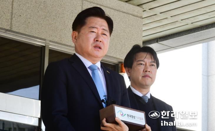 오영훈 지사가 24일 공직선거법 및 정치자금법 항소심 선고공판을 마치고 제주지방법원 앞에서 발언하고 있다. 이상국기자