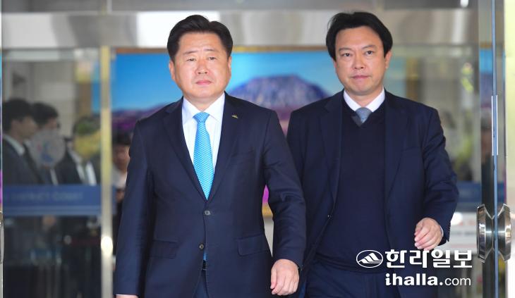 오영훈 제주도지사가 24일 오전 공직선거법 및 정치자금법 항소심 선고공판을 마치고 제주지방법원을 나서고 있다. 이상국기자