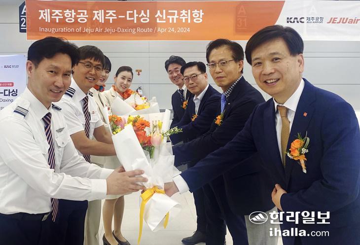 24일 제주국제공항에서 홍준모 제주항공 안전보안본부장, 김복근 한국공항공사 제주공항장 등이 참석한 가운데 제주~다싱 노선 신규 취항 기념 행사가 열렸다. 제주항공 제공