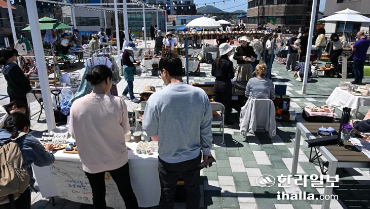 25일 제주시 구좌읍 세화오일장 인근 공영주차장서 열린 벼룩시장 '모모장'을 관광객들이 둘러보고 있다. 강희만기자