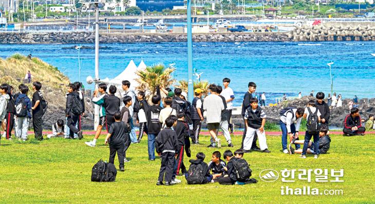 맑은날씨를 보인 25일 제주시 조천읍 함덕해수욕장이 현장체험학습 나온 학생들로 북적거렸다. 강희만기자