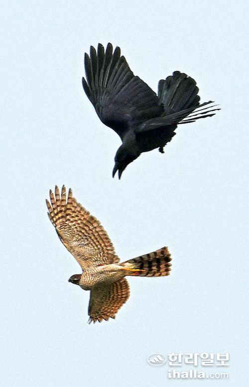 25일 서귀포시 대정읍 하모리 상공에서 새매와 큰부리까마귀가 영역 다툼을 하고 있다. 강희만기자