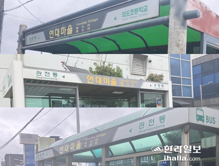 29일 제주시 외도2동의 연대마을 버스정류장을 찾아 확인한 결과, '연대마을'이라고 불리는 버스정류장 3곳을 발견할 수 있었다. 이중 2곳은 서로 마주 보는 방향에 위치해 있었지만 1곳은 800여m나 떨어진 곳에 있었으며, 심지어는 정류소번호가 적혀있는 스티커도 부착돼 있지 않았다. 버스 안내 앱에서는 '연대마을'을 동·남·북 등으로 구분했지만, 실제 버스정류장 표지판에는 모두 연대마을만 적혀 있었다.