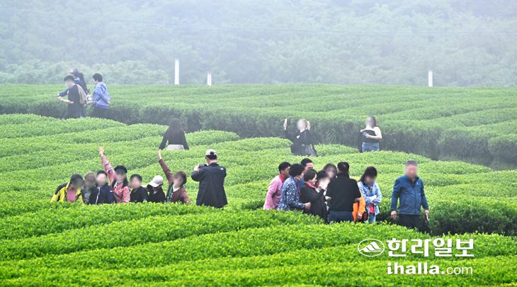 29일 서귀포시 안덕면 서광리 오설록을 찾은 관광객들이 안개 낀 녹차밭에서 사진을 찍고 있다. 강희만기자