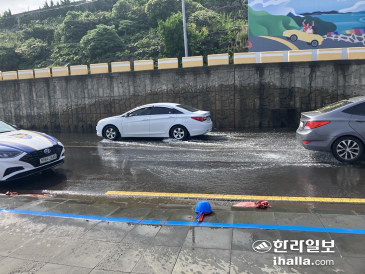 투쟁위의 방류수 관련 퍼포먼스로 인해 도로에 물 웅덩이가 크게 고여 지나가는 차량들이 서행하고 있다.