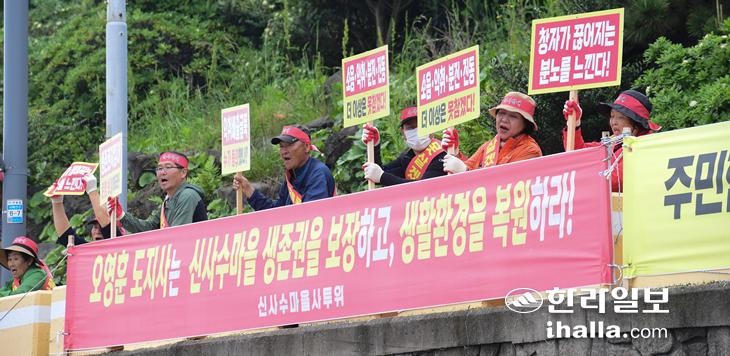 제주시 도두2동 신사수마을 주민들로 구성된 신사수마을 생존권 사수 투쟁위(이하 투쟁위)는 30일 제주공공하수처리장이 있는 신사수마을 앞 포구에서 투쟁집회를 열고, 해양방류관로 신설 반대 및 악취배출 굴뚝 공사 강행 중단을 요구했다.