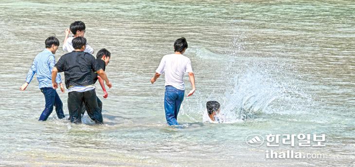 맑은 날씨를 보인 2일 제주시 조천읍 함덕해수욕장을 찾은 다른지역 고등학생들이 바다에 뛰어들어 물놀이를 즐기고 있다. 강희만기자